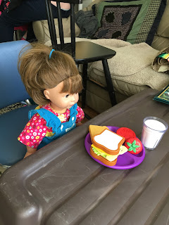 Adrian asked me what makes up a healthy lunch and prepared it for May. How fortunate he and Indre are to have such excellent play food. Even a pretend glass of milk.