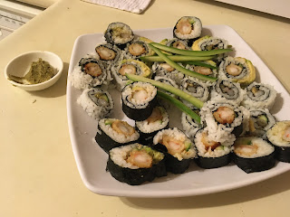 Haven’t had sushi since February. Suddenly realized that I could make several (not so Japanese) maki rolls at home. (Extravagant, yes: I appreciate the self-contradiction) I asked Tamar to add to her grocery list sushi rice, cucumber, avocado, tempura shrimp and fake crab. There was no fake crab to be had, so I went with plain shrimp California roll and a Dragon roll with the tempura shrimp. I am a rank amateur and my sushi is not pretty, but it was quite tasty nonetheless.Tamar had to look around for the nori (seaweed) and she even ordered a couple of sushi mats for rolling, which was very kind of her. I had been trying to figure out what would make a good substitute. One thing I learned was that preparing ingredients beforehand, while it is helpful for many recipes, is not appropriate for good flavorful sushi. One must commit to the time it will take to freshly cut the avocado, and to bake tempura shrimp immediately before assembling the maki. There are a thousand sushi recipes and videos on the web. I found it helpful and also inspiring to watch a Japanese sushi chef at work. It reminded me that practice is required for any skill, lots of practice.