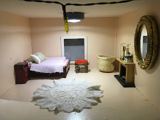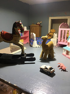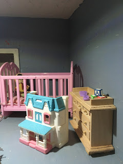 I brought it home grinning gleefully and soon had it set up on its new home and display table, a vintage kitchen hutch, wooden, with shelves behind glass and wooden doors and a formica counter. The house was a perfect fit. It was safe and easy to enjoy in what was a spare room at the time. (Now it is K’s room – but I don’t think he plays with the doll house.) I fetched out my collection of 35 years, almost all of it second-hand, of small chairs, tables, dishes, lamps, cups and saucers, jugs and jars, beds and cribs, and a few tiny knives and forks. I had enough to completely furnish my new house! I have spent the years since finding stoves, a fridge, more dishes, purses, tiny dolly toys, tiny dollies, paintings for the walls, step-stools, sleds, rakes, a miniature sewing machine (pencil sharpener) and more, again mostly second-hand. It is endlessly delightful, innovative and creative to find more doll-sized treasures to add to the decor; transforming scraps of cloth into curtains, finding a tiny camel and a rocking horse for the children’s room and a pin cushion stool for the master bedroom. My inner child gets way too much play-time!