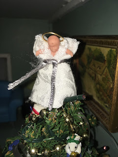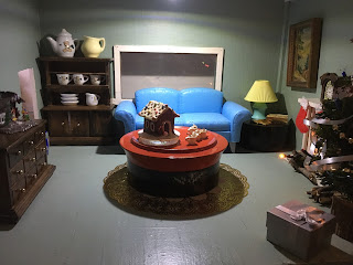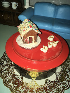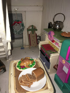 Yesterday Indre and I decorated the little house for Christmas. We have a tree and a turkey, a wreath for the door, even a tiny creche and gingerbread house! Everything is ready for Christmas Day. I made a little angel for the tree and stockings for the mantle and a fire in the fireplace. The turkey, the gingerbread house and the apple pie on top of the stove were created by a talented 13 year old who was selling them at the Applewood Shaver Homestead Christmas show and sale a couple of years ago. Her wares would have made the cut of the One-of-a-Kind show. I didn’t see the Applewood Shaver show in the paper this year, but I wasn’t looking. Keep an eye out next year – many local artisans take part every Christmas (except in a pandemic). The bottles peeking out from behind the kitchen counter are orange and lemon flavoring. I found them last week at Vatra on Bloor, the “bread” too is from Vatra – Milanowek Milky Cream Fudge, made in Poland.