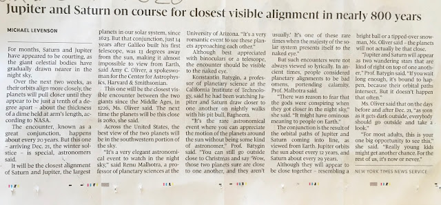 This month Jupiter and Saturn perform a dance that happens only once in 8 centuries. The “grand conjunction” is especially close this year and occurs on the Solstice, which is quite magical! The writer says it quite poetically so I will just copy the article below which appeared in the Globe and Mail, December 7, 2020. The image can be made bigger: with a touch screen just do the thumb-finger thing, with a regular computer you can use “control + ” or click on it, being a photo it will get bigger to fit your screen.