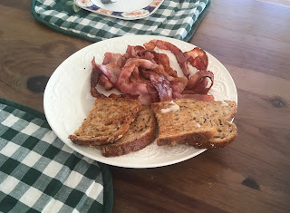 Breakfast feast: bacon, buttered toast and fried bread (in bacon fat) like my mother used to make when I was little. These clementines were the sourest ever so I warmed them and tossed them with honey. Still sour! but sweet too.