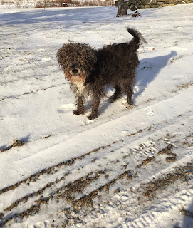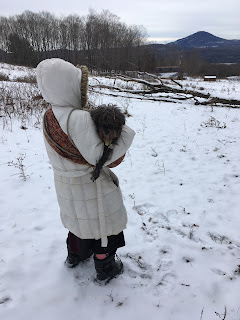 Fig is better today: still can’t see but he is beginning to be aware of obstacles and locates me more easily. He is holding his tail up again after carrying it down in fear position and he is wagging more. He came for a walk off-leash yesterday and followed me very well. K and I walked over to the second meadow and Fig walked part-way on leash. When we got among the trees I put him in a carrier I fashioned from a pashmina for the rest of the walk. I carried my children in an Indonesian-style baby carrier like this until they were heavier than he is, so it wasn’t difficult. He seemed happy with it and didn’t growl or wriggle. I hope he will get the hang of following us while finding a path between the weeds and bushes, perhaps begin to follow our footsteps more closely.