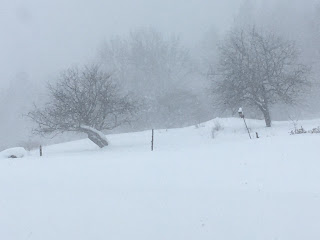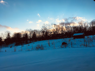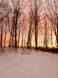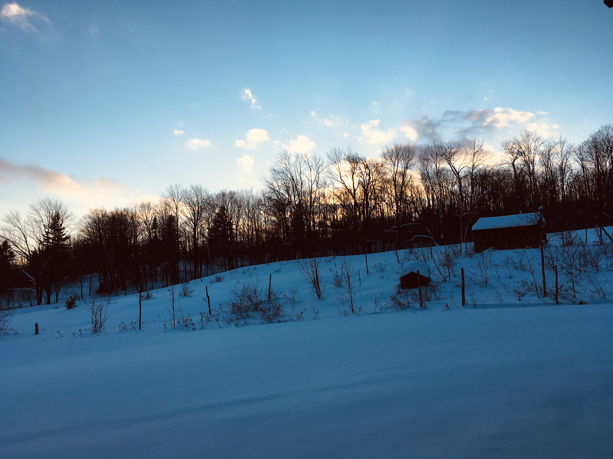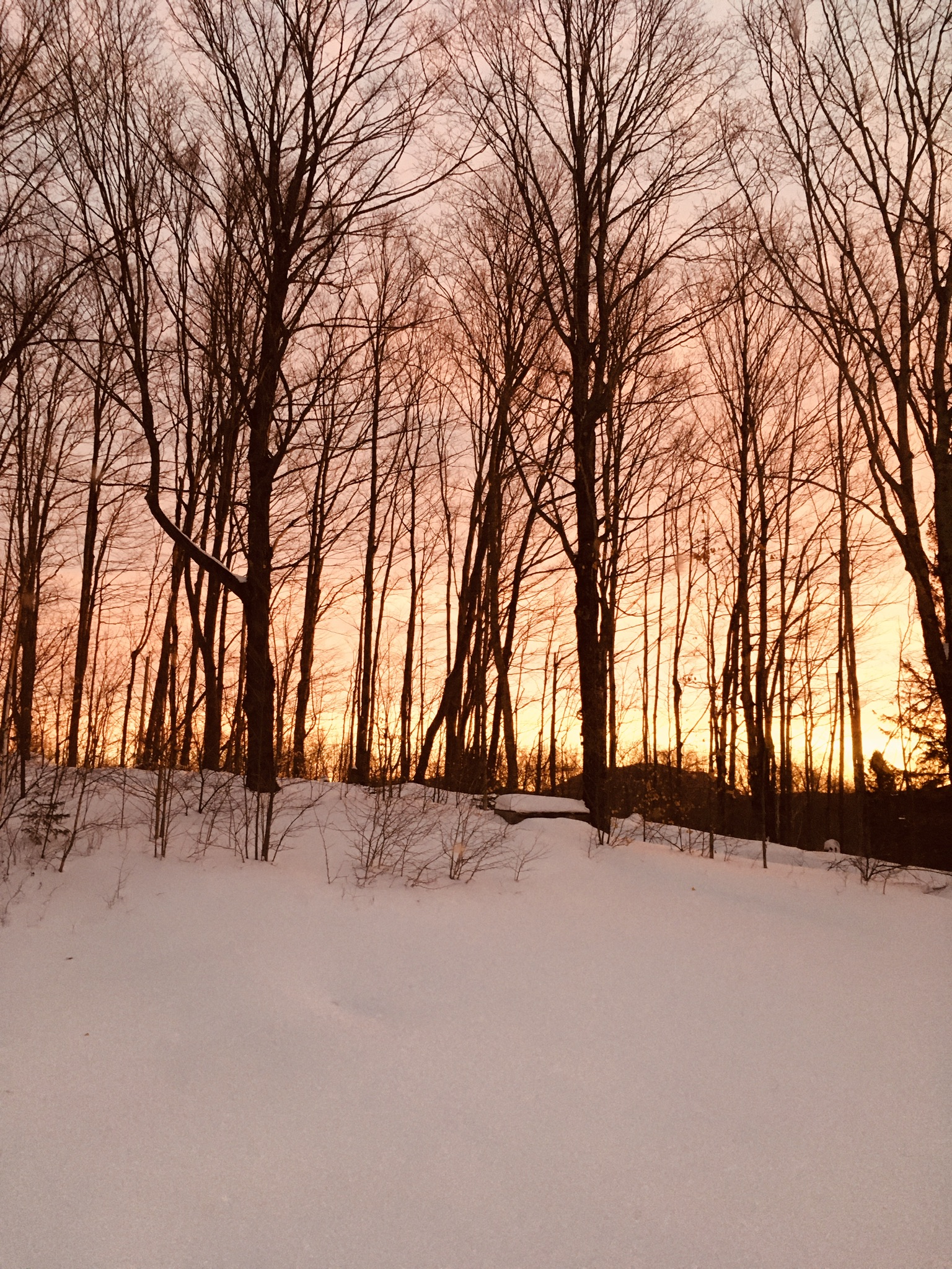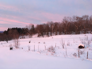 The clouds returned at noon; someone shook the snow-globe again and the world shrank once more, shrouded in snow beyond our circle of trees. Now as the sun is setting it has cleared and the southeastern sky is pink again.