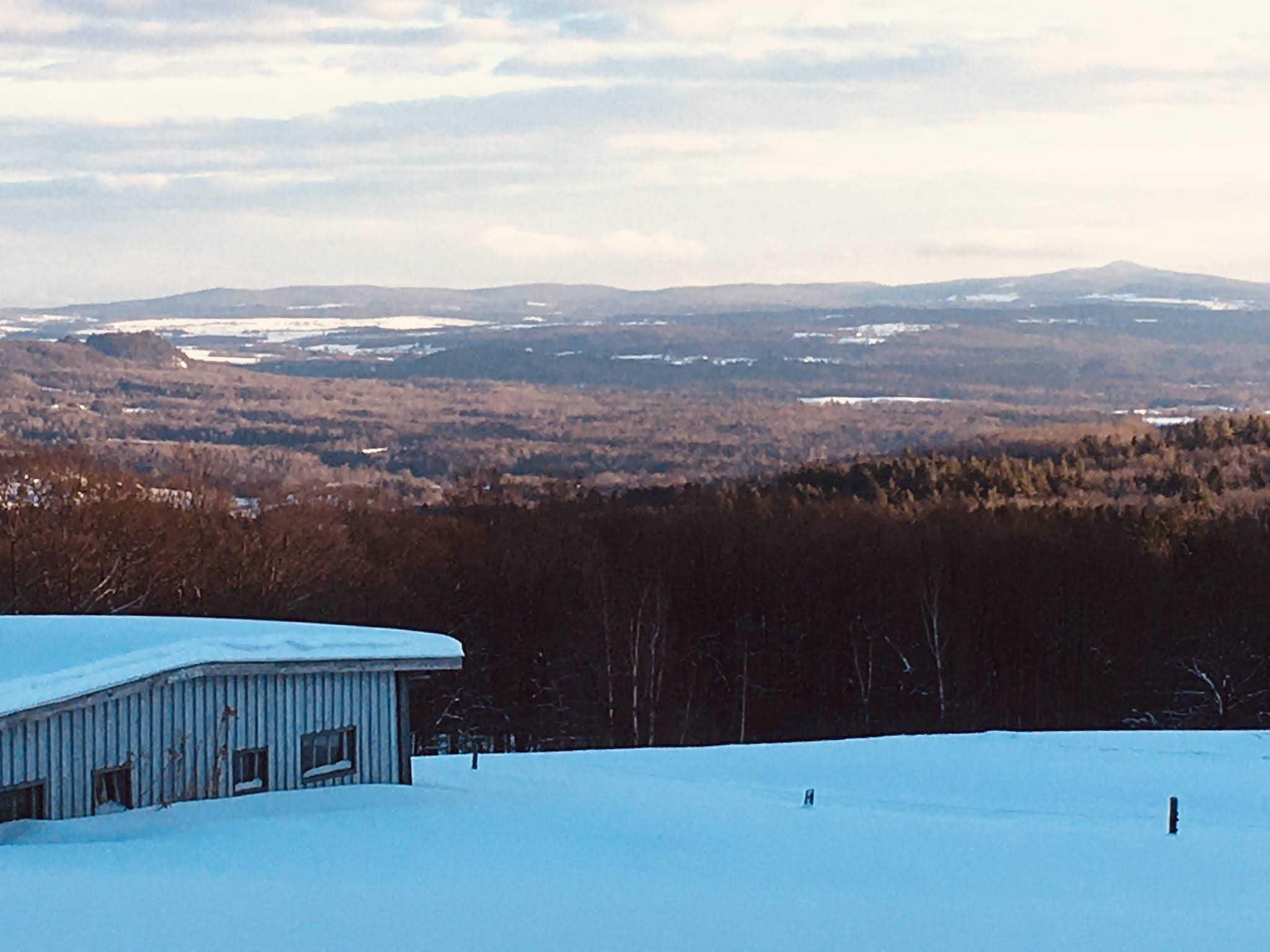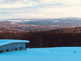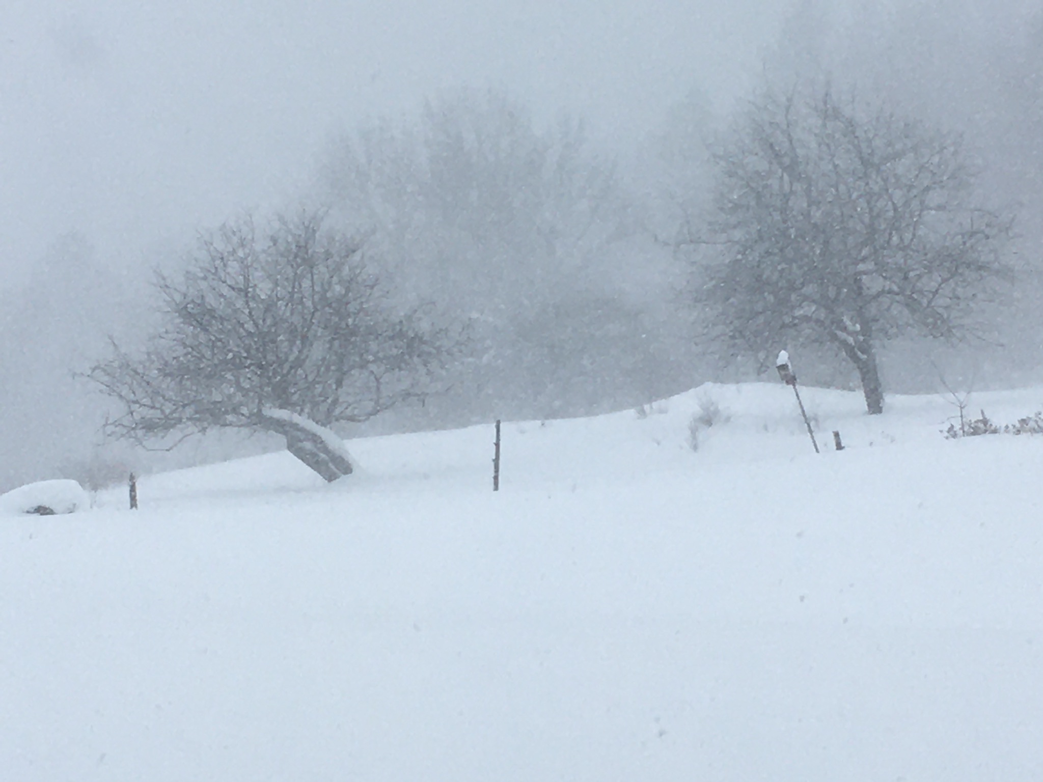 On Thursday, K came with us on our walk and we went past the farm along to the post boxes on the road to town. The fields of snow were undisturbed all the way to the tree line: their sheer white expanse was like something from a dream, so surreal the rises and contours of the land rounded and smooth with the blanket of snow. The road itself was white because they don’t use salt and seldom sand on the smaller roads. As we turned back towards the snow-covered outbuildings of the farm on the corner and the sun at our backs cast our shadows blue along the road I found that I had dropped all the past and future ideas and I was aware only of the beauty of hill and tree, the joy of walking – there was nothing else to do or think about.
