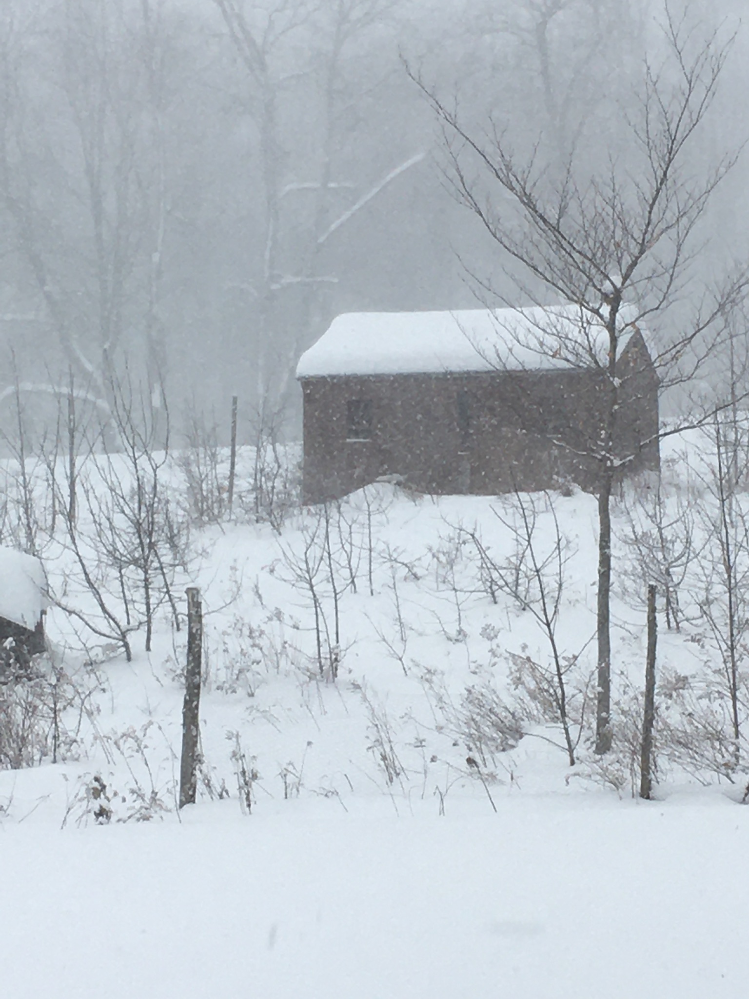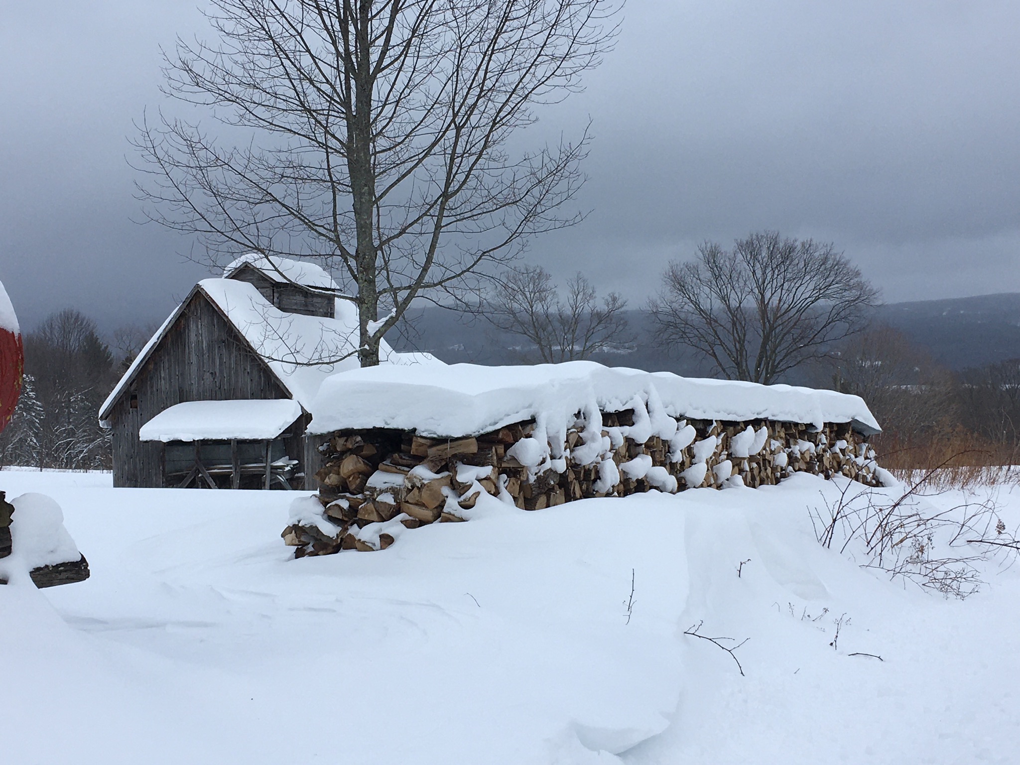 The farm’s old barn, and the woodpile, like fruitcake with icing!