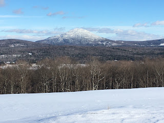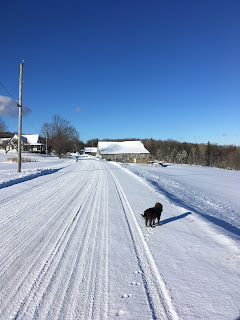Wednesday was warmer and before the snow started again Fig and I went for a walk down to the farm, our next neighbours down the hill. (We have one neighbour above us on the road – the family that Blackie lives with.) It was our first walk in a while, because Fig can’t manage if it’s colder than minus 10. I put him on leash and we set off. He seemed excited and ran along beside me down the road. After a while I let him off the lead and he seemed to sense where the road was and barely ran into the snowbanks at all. He enjoyed smelling along the road and you wouldn’t know he couldn’t see! It was reassuring to see him so happy.