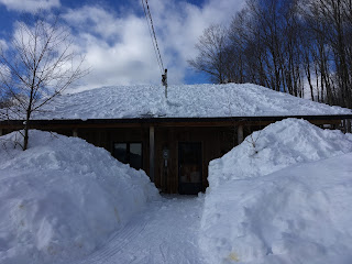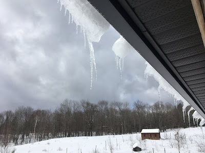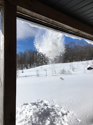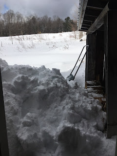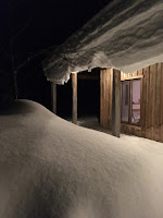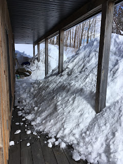*UPDATE!*: This morning I was sitting on the porch and suddenly there was a rumble of avalanche proportions and I jumped up to see snow falling from the west roof. On the left is the woodshed before 10 minutes ago, where K had cleared the space for fetching and chopping wood. Here it is now! All day the roof has been dripping with melting snow. The village calendar was spot-on!