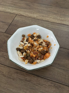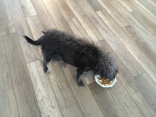 I cooked three pounds of chicken and 4 sweet potatoes, for us and for Fig. I want to start feeding him home-prepared meals along with his crunchies. I never tried it before because my other dogs weighed 110 and 135 pounds: that’s a lot of “people food”. But I realized that for little Fig it wouldn’t be too much. I don’t yet know what I will do with our half of the sweets and chicken, but it’s nice to have them cooked  and ready to go.