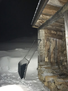 Sunday morning two young mountain men arrived in a red pick-up with ladders and shovels to clear the roof! Roof clearing was happening all around the village, there must be a note on the calendar that it is time! The snow began to cascade outside the windows like waterfalls. We spent the morning watching the progress.