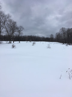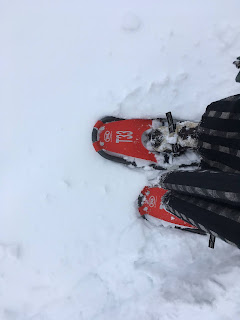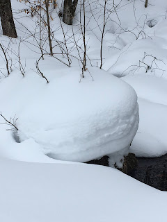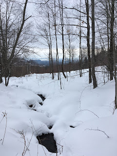 Tuesday was a lovely day to be outside though it was cloudy off and on. Tal has leant me some snowshoes. I figured out how to work them – they are fancy ones – and then I went out for a hike! It wasn’t difficult, though I sank perhaps 3 to 5 inches down, sometimes a lot farther! I thought to keep the toes up, which helped. These are quite fancy snowshoes, their harness is adjustable to fit your boot and the straps go around your ankles. I couldn’t find this model on google; they might be quite old. I must look for a pair of poles at Reilly House next time I go. If I had fallen over it might have been a challenge to get back up! What a delight to be able to go and see the witches and the west meadow – I haven’t been there in weeks. The creek along the ridge was still running under the snow and ice. It was all so beautiful and dreamlike.