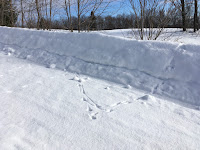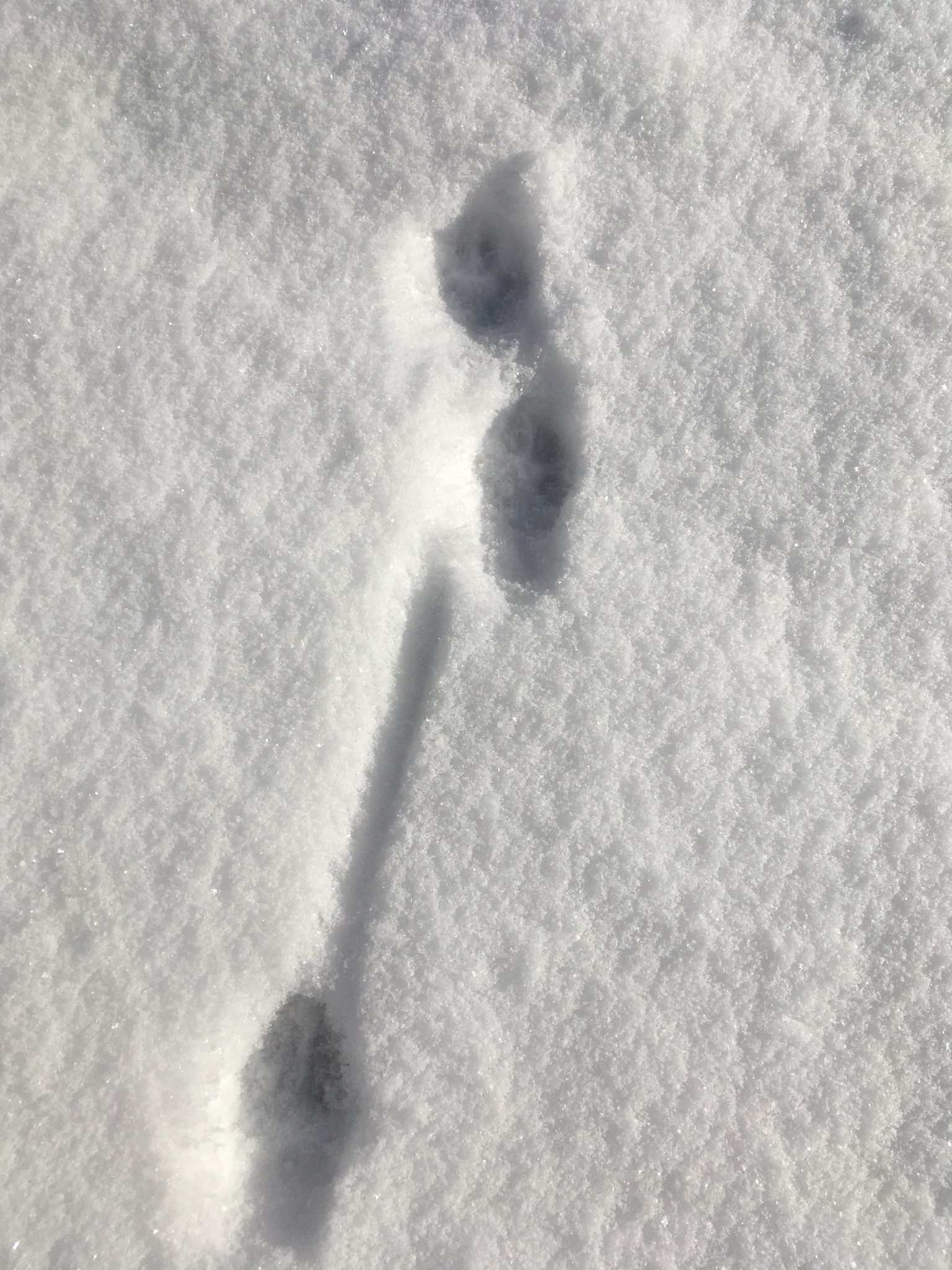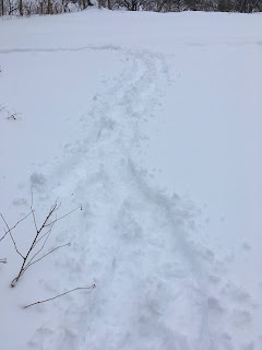 Sunday afternoon we sat on the porch, it was about zero degrees. Rain and Tal came to sled in the afternoon. We had a visitor Saturday night, I suspect a lynx or bobcat looking at the paw prints, You can see where he sniffed about probably sensing Blackie and Fig. In the picture below you can see his prints across the lawn from the chicken house!