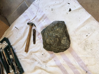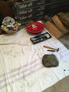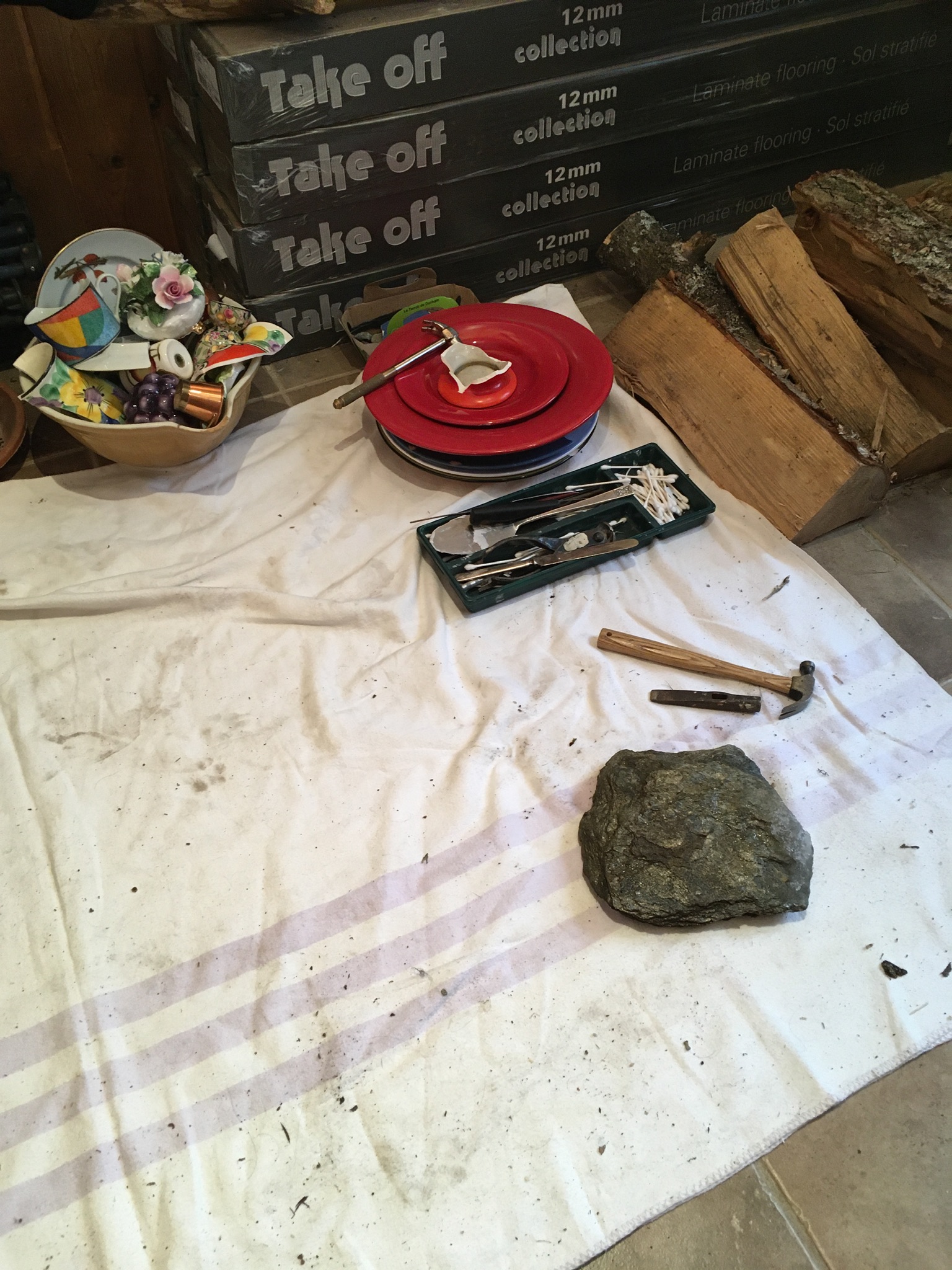 Monday was a 5 star day. I set myself a goal of starting my mosaic bowl and was very pleased to end the day with all the pieces broken and coming together. It is exciting to see it working because it is mostly fortuitous brokens all Quebec-found and random breaking. At home I have a room full of dishes, figurines and knick-knacks to pick and choose from. The witches left me a “breaking stone” by the front door on which to place a dish for smashing. Probably the only stone to be found under all this snow, I remembered seeing it and kicked it free. I worked in the mud room.