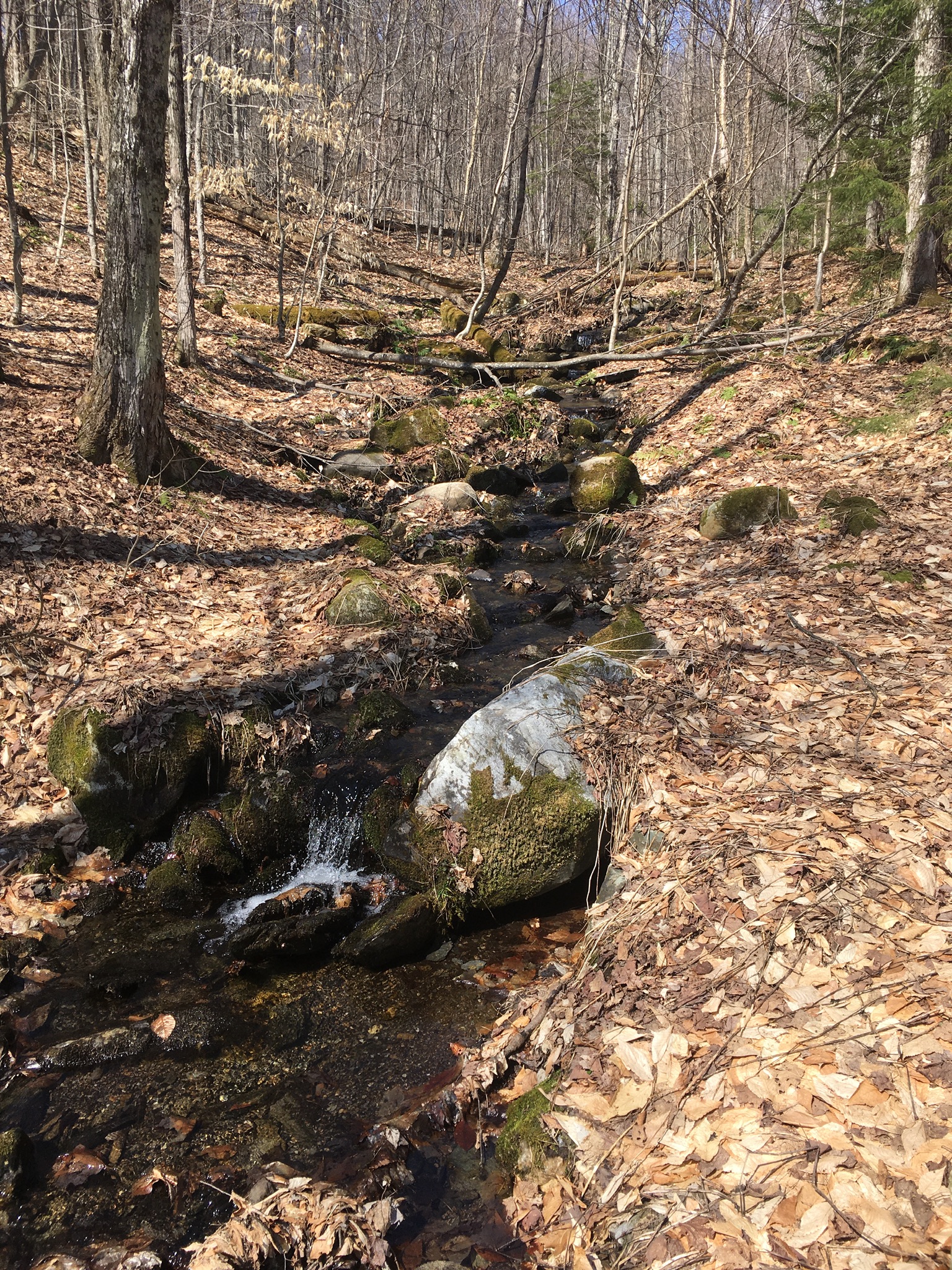 I haven’t been to our pond today. K and I took a walk south of it today, over the ridge into the next valley. The forest floor was covered with brown-sugar leaves and the sun shone through the naked branches. It was hot and smelled of evergreen needles. There was a pair of woodpeckers, Hairy, I’m sure, but they seemed bigger, perhaps being in a minimalistic gold and black forest. Small creeks trickled everywhere taking winter snow downhill, and farther – they must all reach the Missisquoi River or settle down into the water-table, which I guess to be higher than the superimposed river at the bottom of the valley. I know nothing about the water table! I have to learn! It must relate to the placement and depth of wells. There is so much I want to know, I should have started years ago. Perhaps I did start, but there was other stuff to learn, when I was 20, and 30…