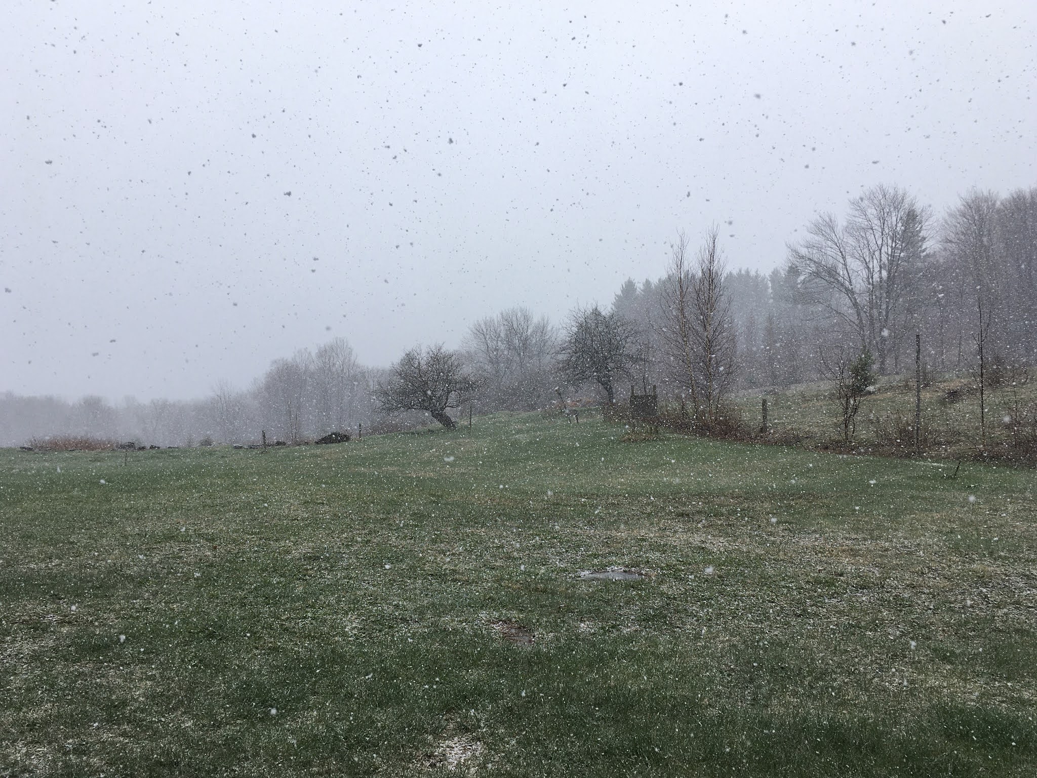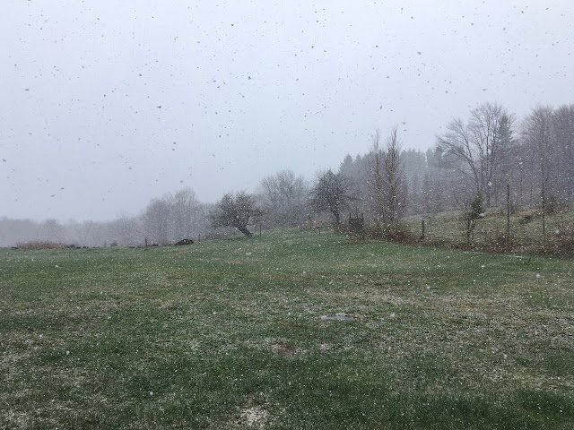 The snow has begun to fall: large wet flakes coming straight down in the still air. I have made some tea and the beans have finished soaking. I will put them to boil and have my tea by the fire. K is out for a walk but he will be back soon. He often walks up the camp road and then down through the second meadow; I expect I’ll see him step out from the ridge woods before long.