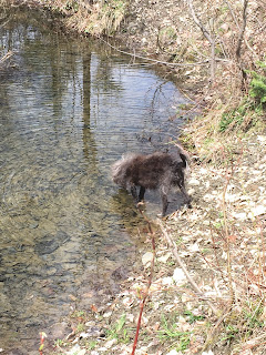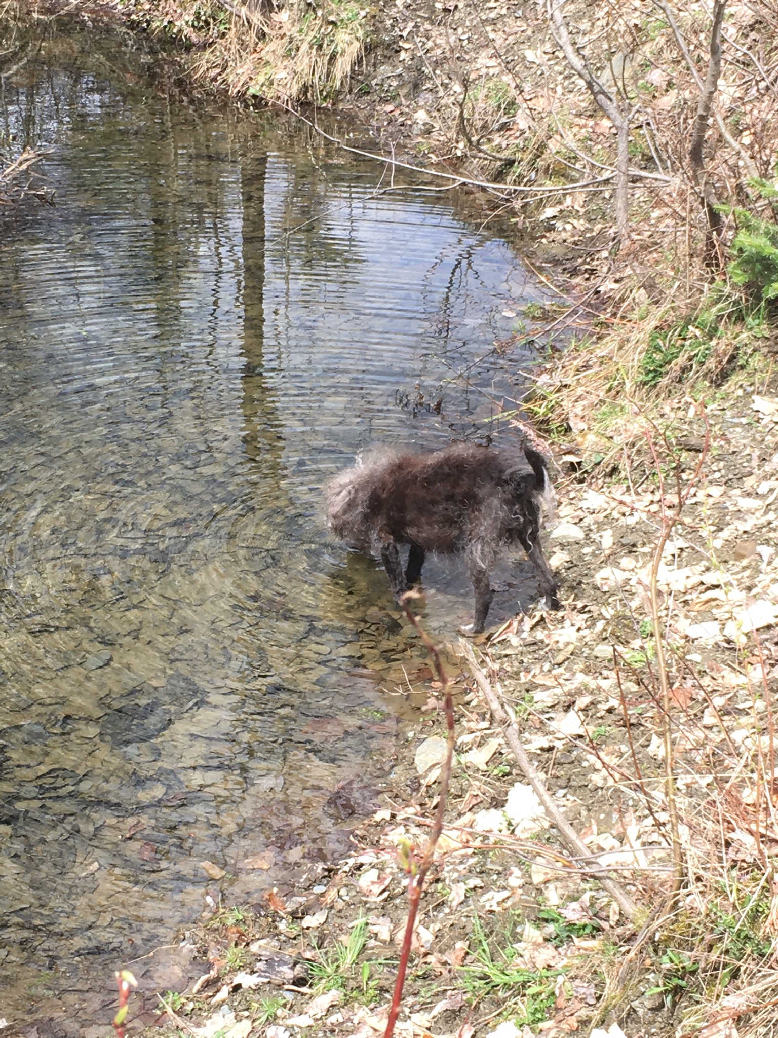 He loves to drink from the pond and the stream. Male-pattern dog baldness. How grey he is.
