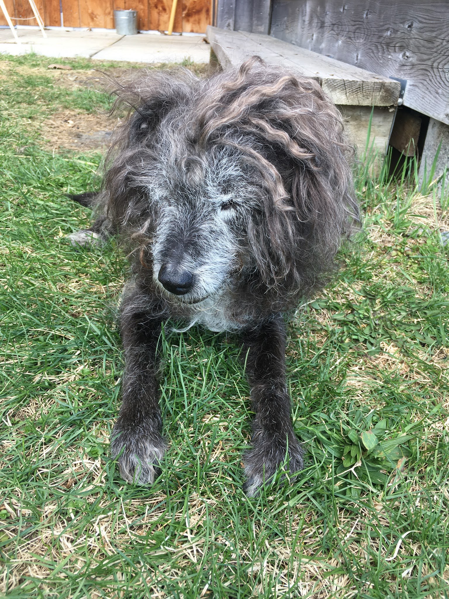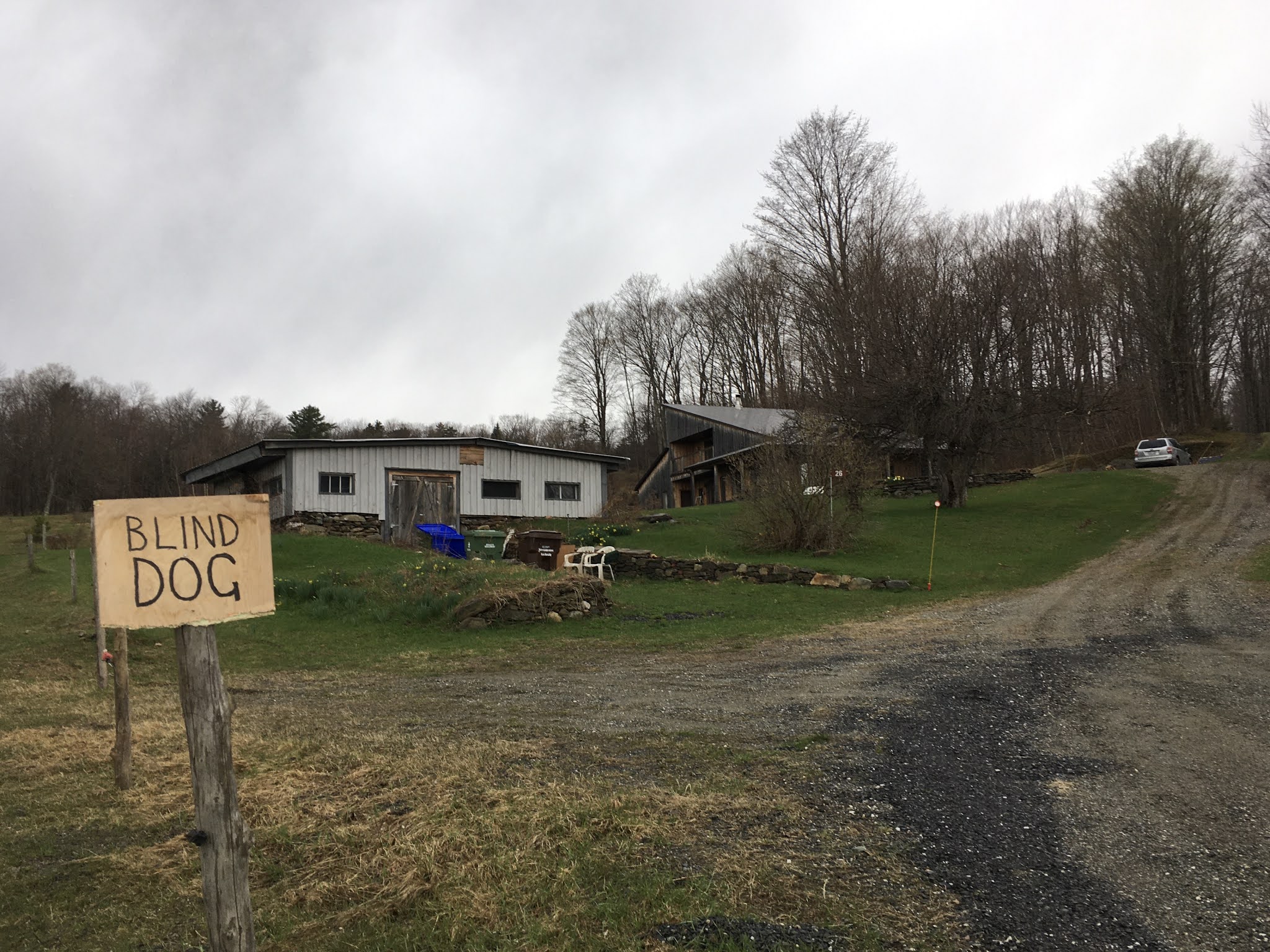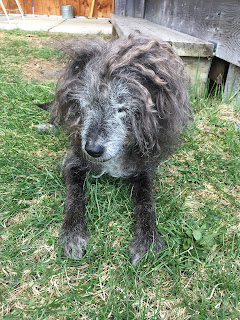 I put up the “Blind Dog” sign yesterday and already the name “Blind Dog Hill” is beginning to sound familiar in my mind. Fig is skinny as a rail now and his hair is falling out – mostly his long coat, his short, darker coat is so soft, but I feel his ribs under it. He continues to play but not so long, and likes to go outside; as long as he is with me he is content to walk, or lie on the grass and listen to the meadow sounds. The other day he growled when he heard a handful of robins fighting over a nest by the henhouse.