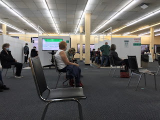 We drove to Cowansville, about an hour away, for our vaccine. We arrived in time for our appointment and were put in line together for our first time-slot. The line moved ahead steadily and we were kept together through the registration process and then the vaccination. We were done and in the post-vaccine waiting area by the time our appointment times were past. It was an efficient system; everyone was kind and helpful, very thorough and professional. We were given our appointment for a second jab in August. We received the pfizer vaccine: we were not told beforehand which we would get, and although we would not have refused any one, we were happy to get this one.