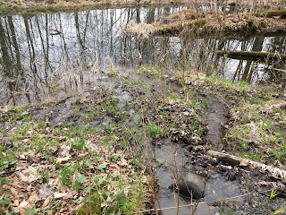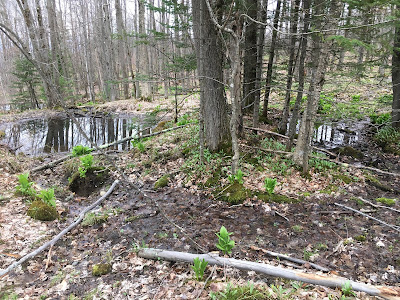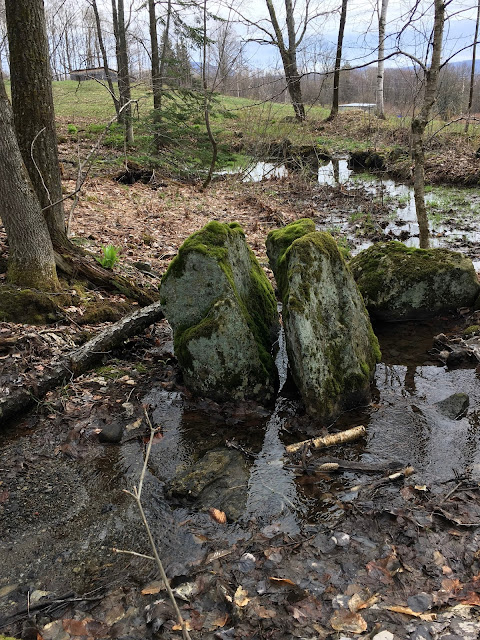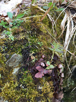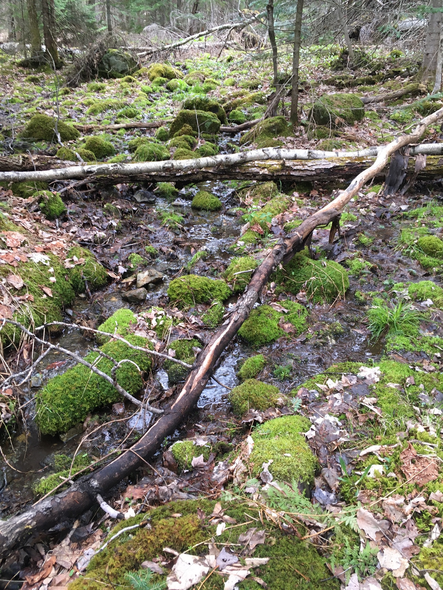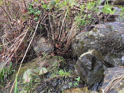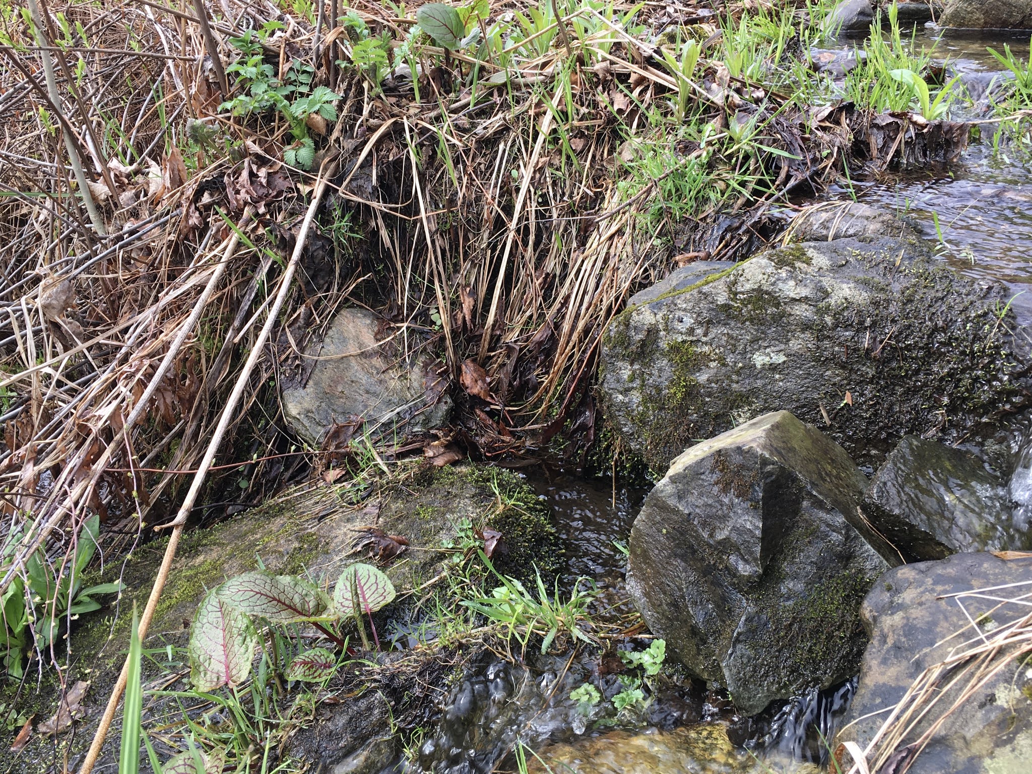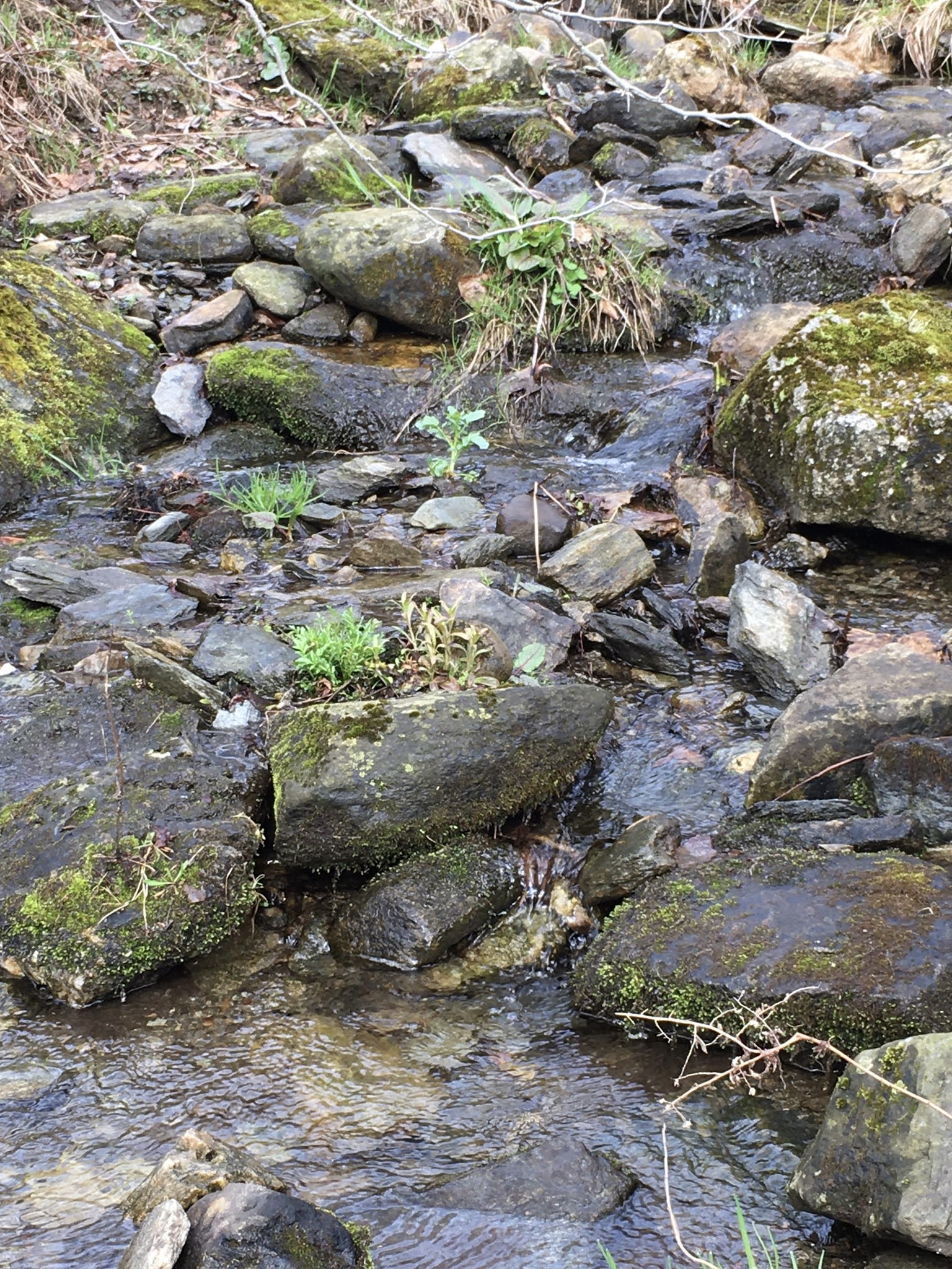 The ridge stream where green life is emerging from the pale winter leaves. The tiny waterway tumbles headlong down and down the ridge, in perfect imitation of a great rushing river with waterfalls, pools and deltas.