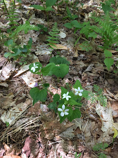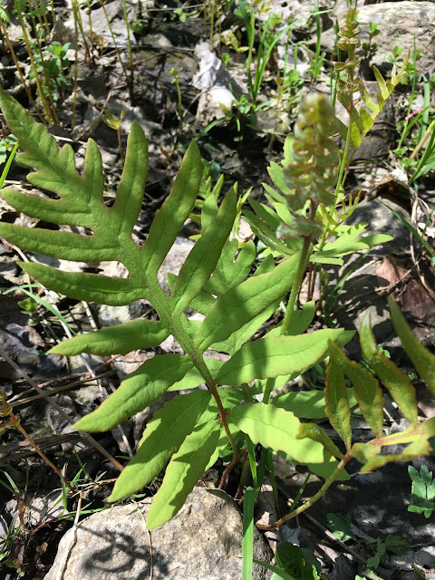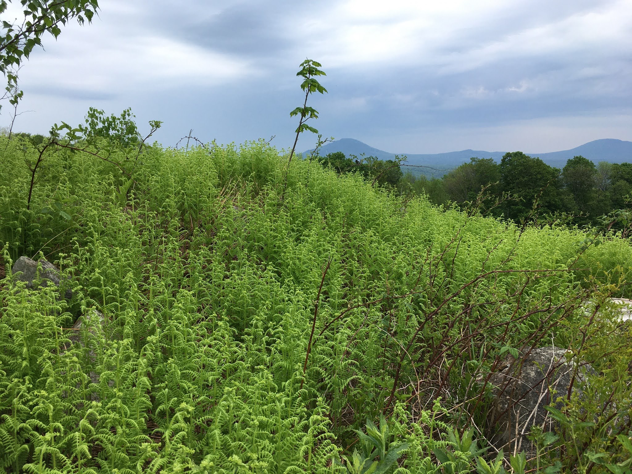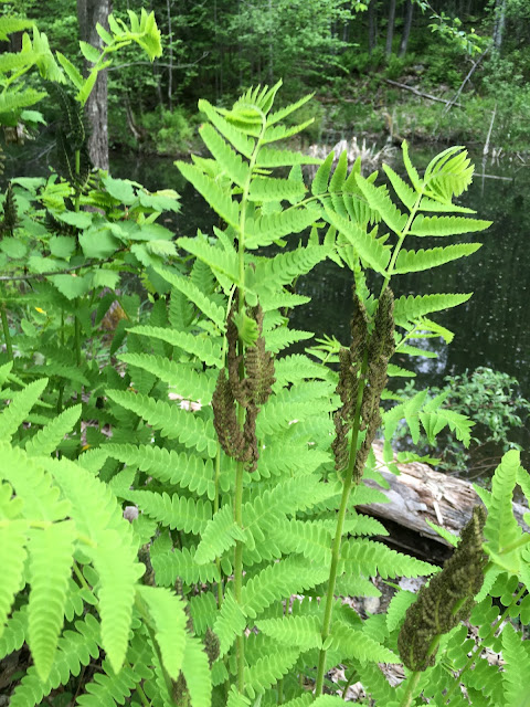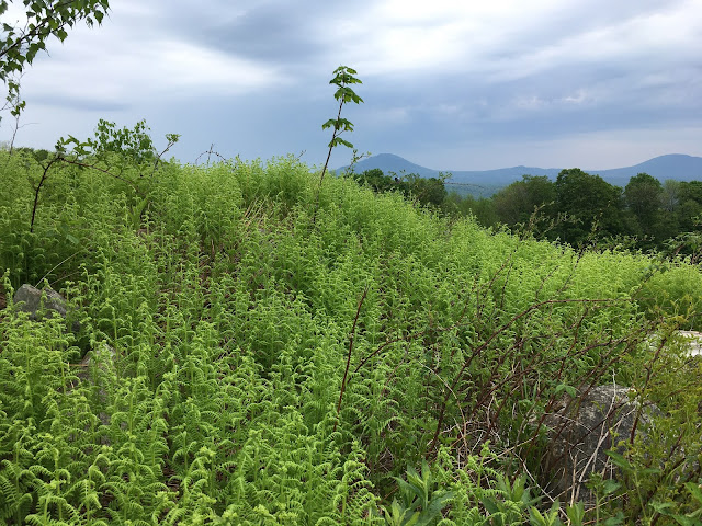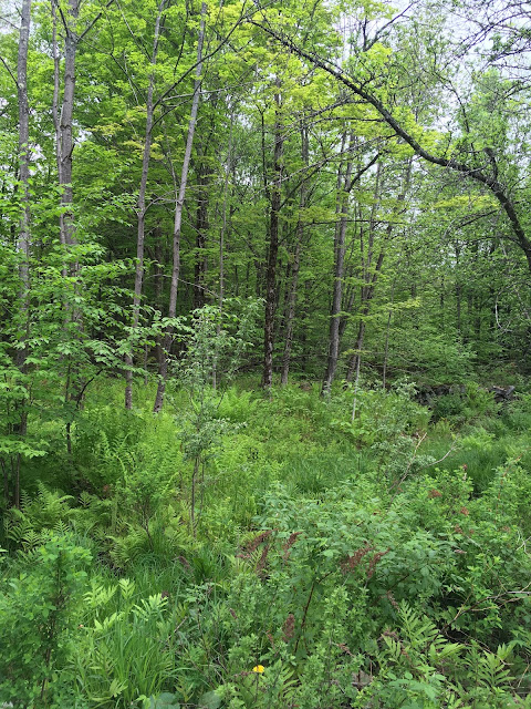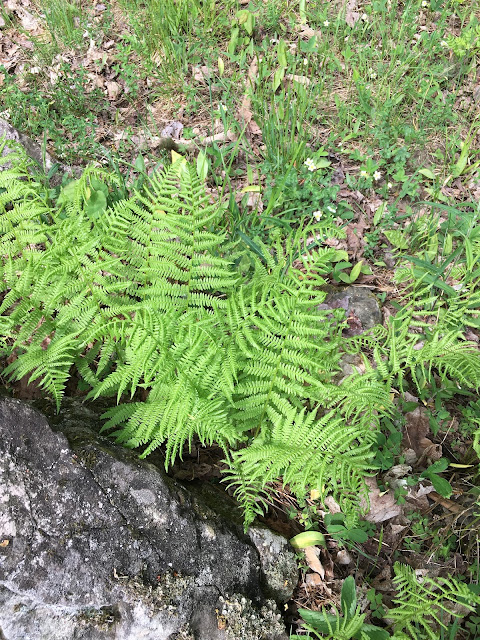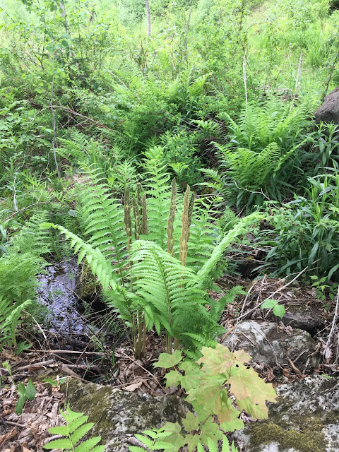Today we walked through a forest suddenly in full leaf with a floor of ferns almost fully open, some taller than our waists and already bearing their spores. The new canopy, though fully grown, is still a fragile paler green filtering the morning sun, while in midsummer the forest will be dark under the trees. Some of the spring rivulets are already dry for the summer, perhaps, or will they run again if we get heavy rains?