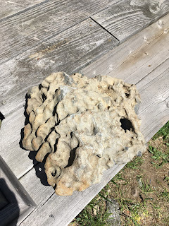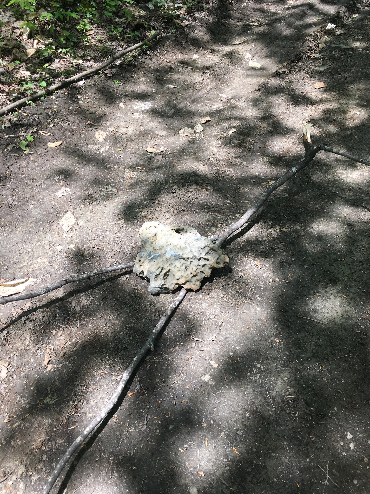 Here is my travois with the rock.  To the right is the rock: unusual with its water-carved ripples and holes, more reminiscent of Huron limestone than the shale and boulders of the landscape here.