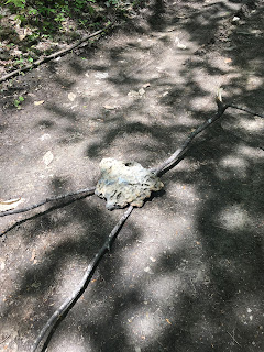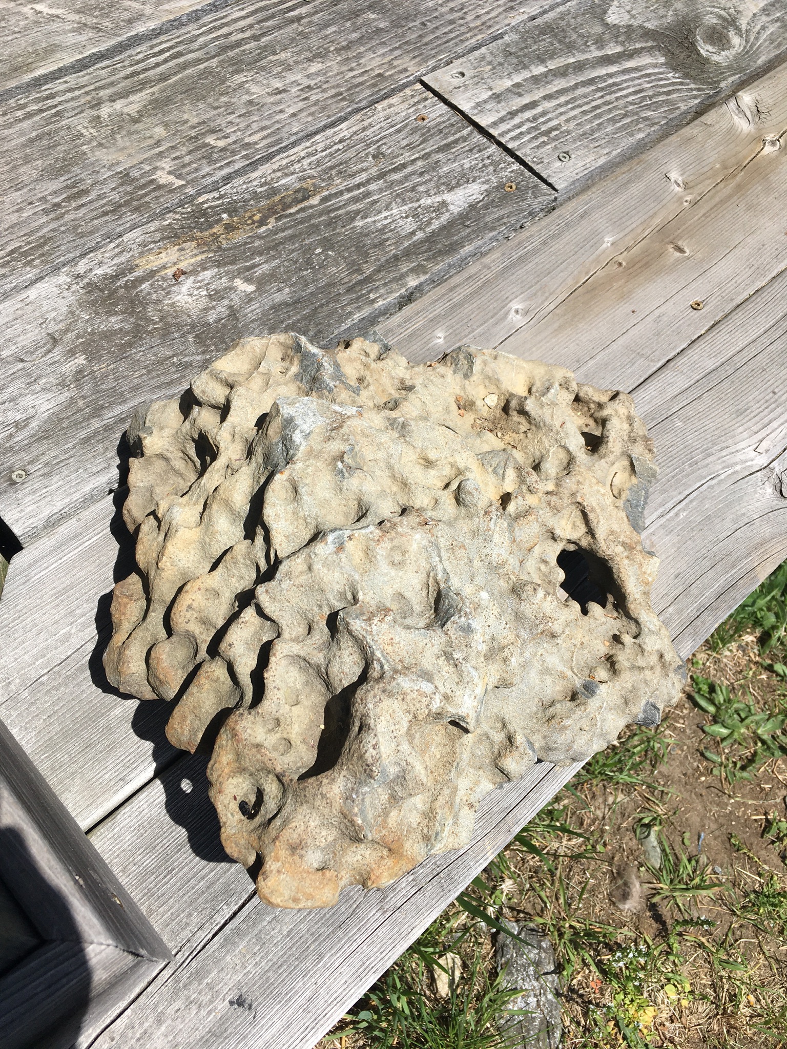 This week I walked up the camp road behind the house to fetch a rock that I had seen earlier in the spring. It is not very ethical to move rocks and plants from their natural habitat, but since I was only bringing it down a few hundred metres from where the glacier left it I thought it wouldn’t be so bad. It had already been moved off the road, as evidenced by the lack of dead leaves, lichen or moss on it. I found a forked branch to use as a travois, for which idea I give credit to the Jean Auel series Earth’s Children, wherein the protagonist devises a travois to draw behind her horse.* I pulled the branch by the fork ends in a reversal of the usual travois, where the fork ends of the frame drag on the ground while two branches meet or cross on a pack animal’s shoulders. It was an easy job then, to pull the stone down the road and through the meadow, the dragging point of the branch taking some of the weight without creating much drag.