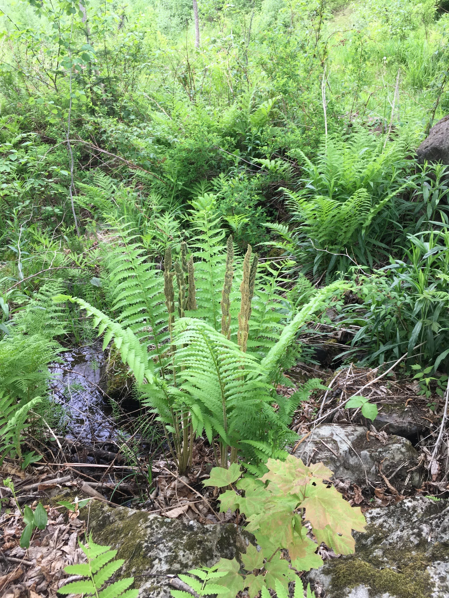 This is that hairy alien-looking fern that sprang up early in the spring: a cinnamon fern. The tall brown spikes in the centre are its spores.