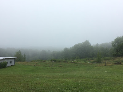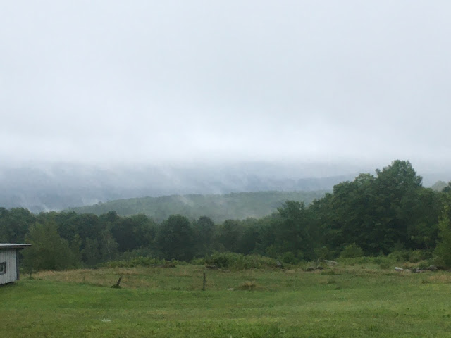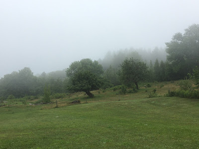 That bit of blue is gone now; the clouds are coming up from the valley obscuring even the closest hills. The trees are silent and still again. How is it that the mists seem so purposeful?