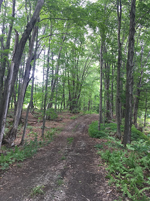 I like this camp road more each day. Now, in the middle of summer, it is calm, with filtered sunlight and a soft-colour palette of last year’s brown leaves underfoot and this year’s summer green above. It must be only in spring, when there is enough sun coming through, that flowers can bloom here.