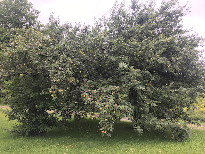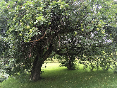 I walked over to see the apple sisters – I sometimes have called them the guardian witches because they stand by the driveway – they are beautiful now, heavy with apples already turning red. It is a pair of trees, growing together into one canopy.