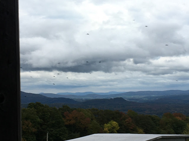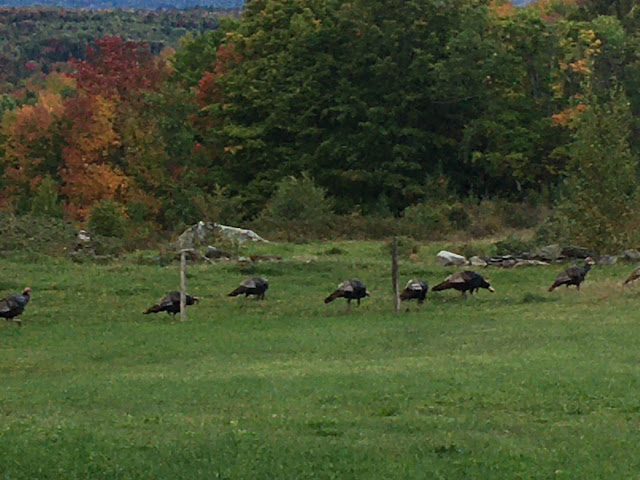 The crows are amassing, preparing to go south perhaps. Some crows migrate, while others have learned to stay the winter. A rafter of turkey toms is hanging around the meadow, enjoying the windfall of apples under the witches and the guardian sisters. They run off when I go outside to the porch, but sneak back when they feel safe again.