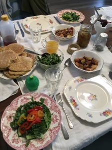 On Tuesday I prepared this meal, plant-based and mostly whole foods. Pancakes made from sourdough starter and mashed chickpeas, steamed asparagus (in season now), spinach and cucumber salad. There is processed whole wheat flour in the pancakes, processed vinegar and mango juice for salad dressing, processed sweet zucchini pickle, canned cranberries (added sugar), and lime juice for the asparagus. I cooked apples and added raisins and dried cranberries (processed, sugar added?) for sweetening. I enjoyed preparing it.