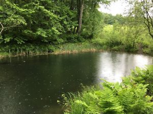In the woods I was unaware that it had started to rain again, then I came to the cow pond.